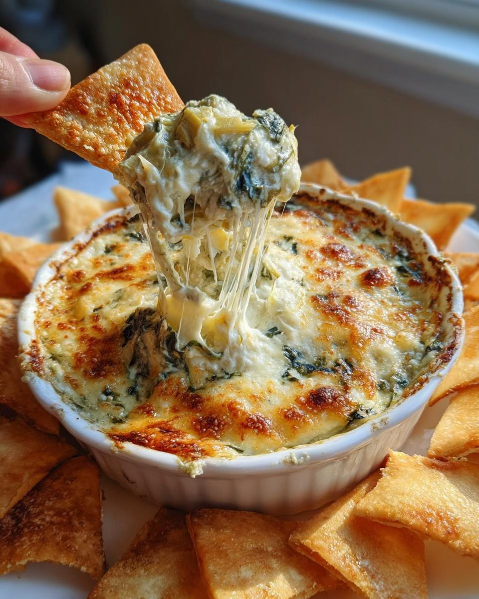 A creamy and flavorful spinach and artichoke dip served with crispy pita chips. Perfect for parties or snacks.