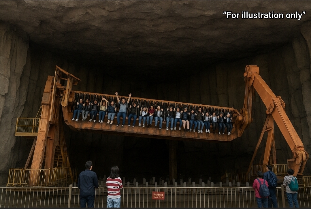 On that day, the atmosphere was full of energy. Dozens of visitors strapped themselves into their seats, laughing, chatting, and recording videos on their phones. The ride was housed inside a massive cavern-like structure, with artificial rock walls towering above and spectators standing safely behind fences, ready to capture photos of their loved ones.