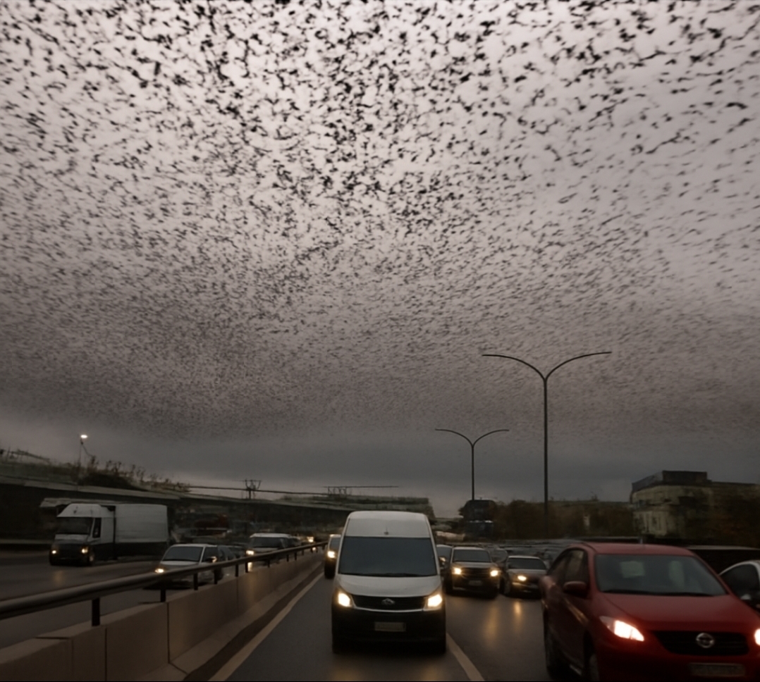 Eyewitnesses captured eerie footage showing what looked like a storm at first—but instead, it was an enormous swarm of birds, moving in haunting, synchronized patterns across the gray sky. The unsettling moment caused traffic to slow to a crawl, with drivers pulling out their phones to record what many described as “a warning from nature.”