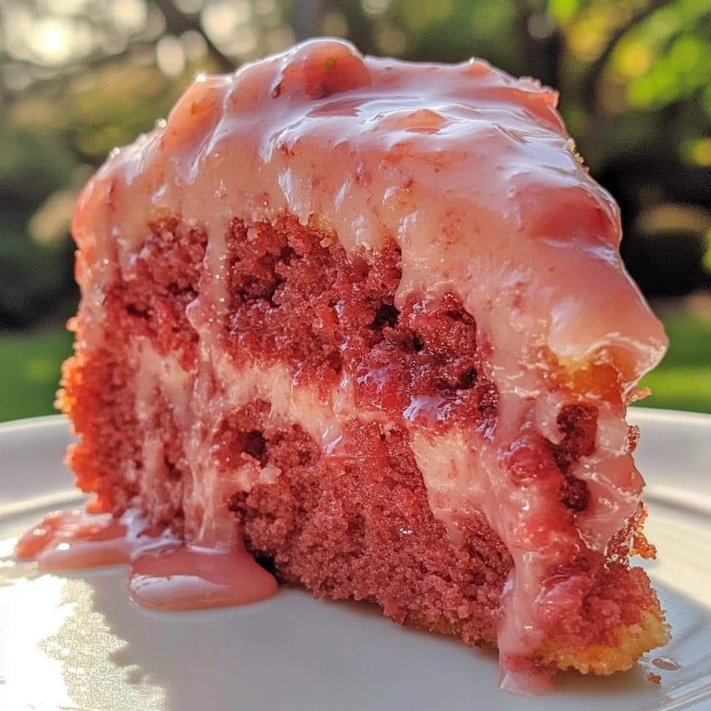 Slice the cake and enjoy this delicious Strawberry Honeybun Cake with its sweet strawberry icing!