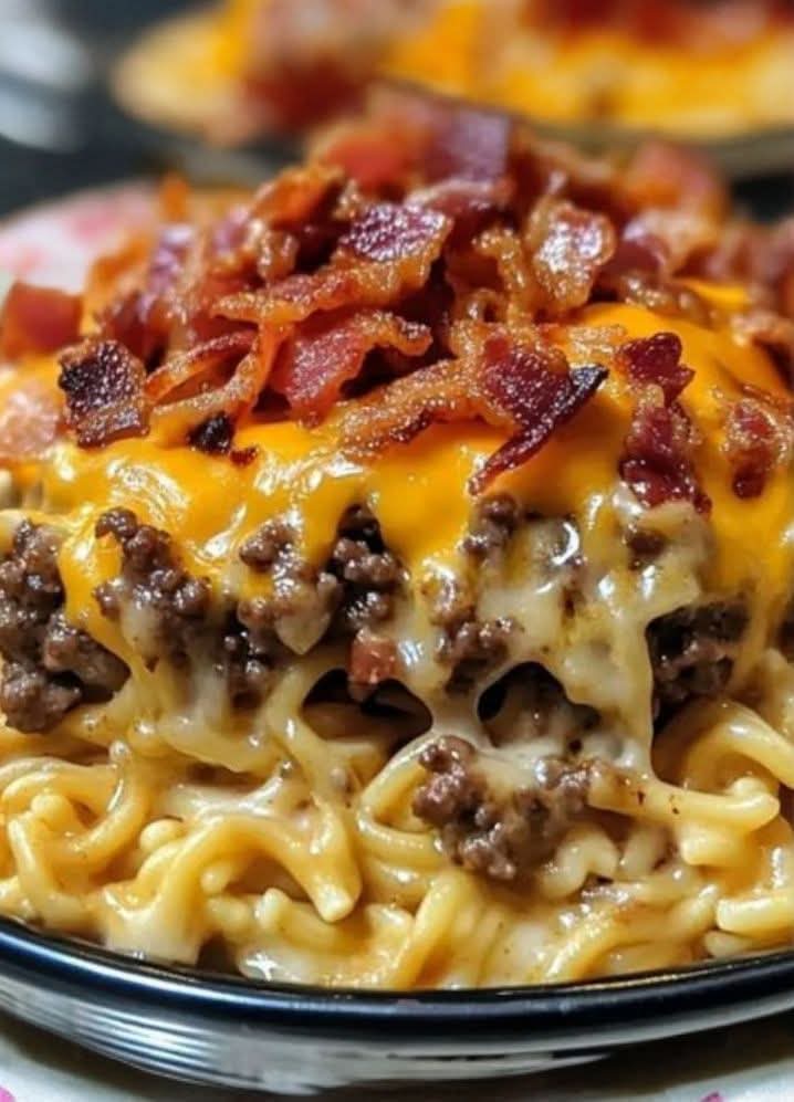 In a greased 9×13 baking dish, mix noodles, beef mixture, bacon, and creamy sauce. Spread evenly.