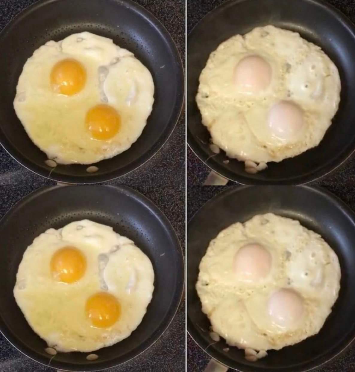 First, crack your eggs into a non-stick frying pan. When they start to cook, pour a small amount of water into the pan (yes, you read that right)! Next, put the lid on the pan. After a minute or so, remove the lid from the pan. When your eggs are cooked, serve onto a plate and enjoy!