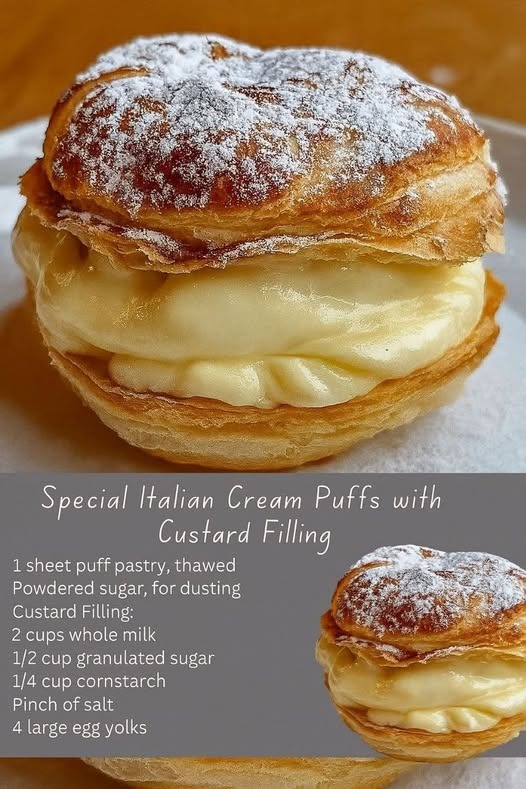 These Italian cream puffs, also known as Bigné alla Crema Pasticcera, are a pastry shop classic. The shells are light and airy, baked until golden, then filled with silky smooth vanilla custard. Each bite combines delicate crispness with creamy sweetness — perfect for holidays, family gatherings, or simply as a treat at home.