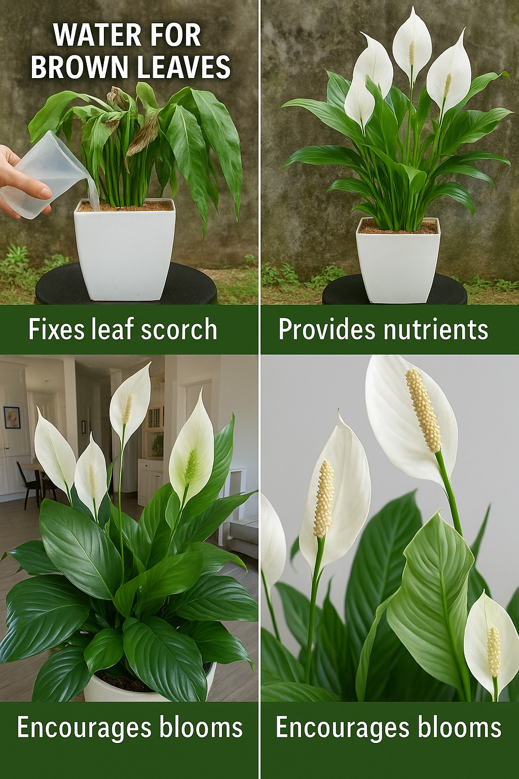 Rice water is rich in plant-loving compounds like B vitamins, amino acids, and starches. These nutrients nourish the soil, strengthen roots, and signal your peace lily to produce more flowers. It’s like a gentle, all-natural fertilizer — no chemicals needed.