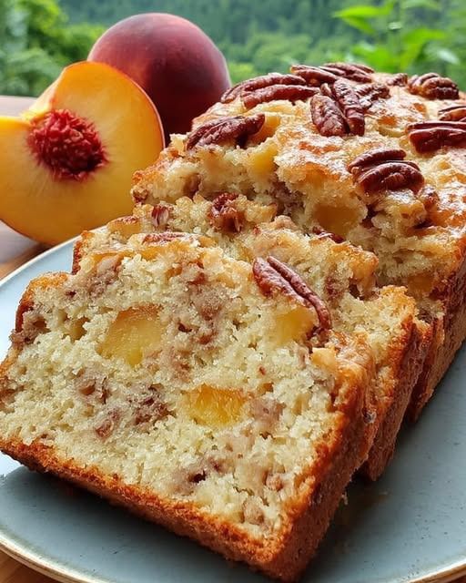 Packed with juicy peaches, crunchy pecans, and warm spices, it pairs beautifully with your morning coffee or as a sweet treat for your afternoon snack.