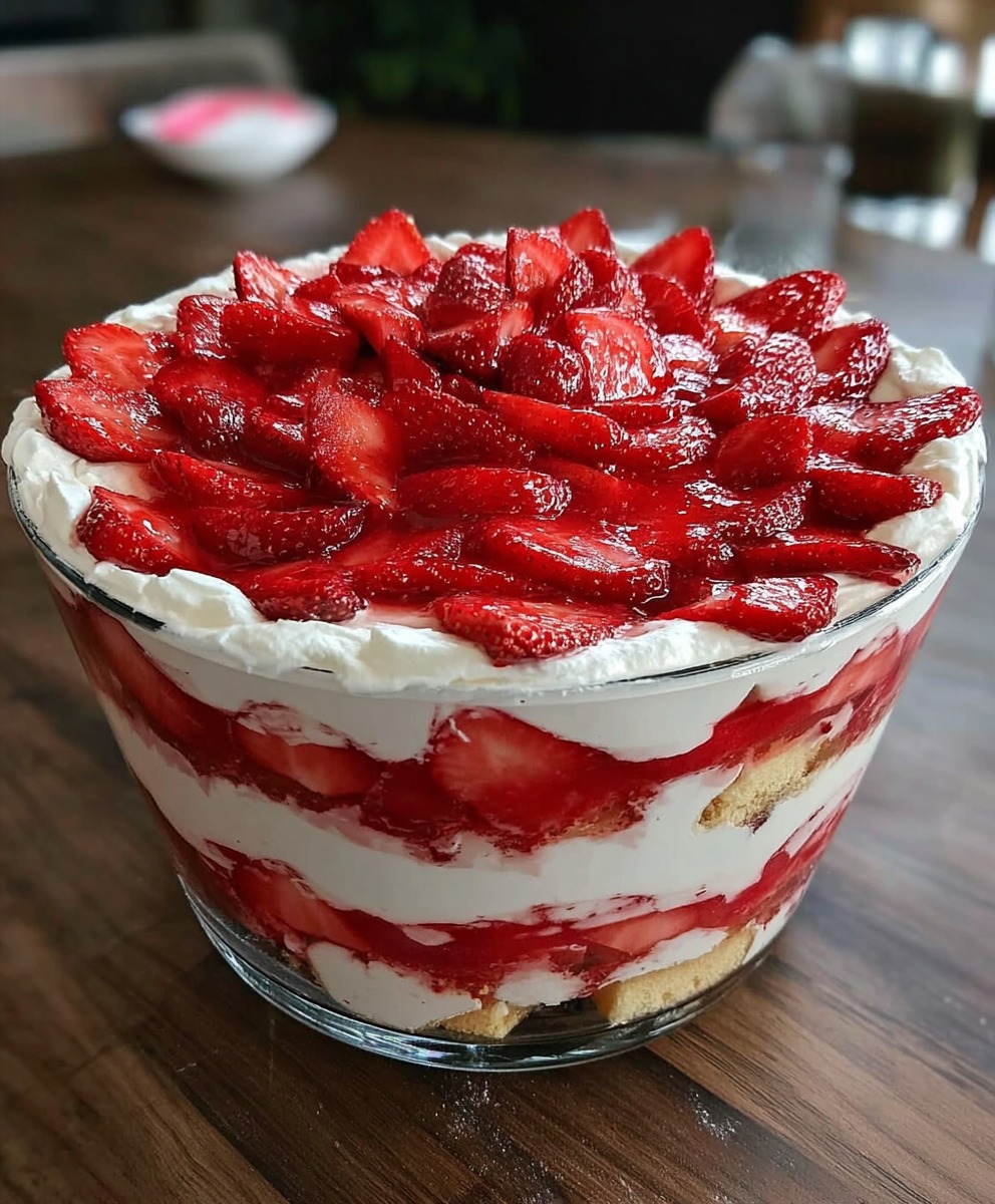 Strawberry Cheesecake Trifle is a delicious dessert made of fresh strawberries, creamy cheesecake mousse, and fluffy angel food cake, layered and topped with whipped cream. A perfect balance of sweet and tangy flavors.