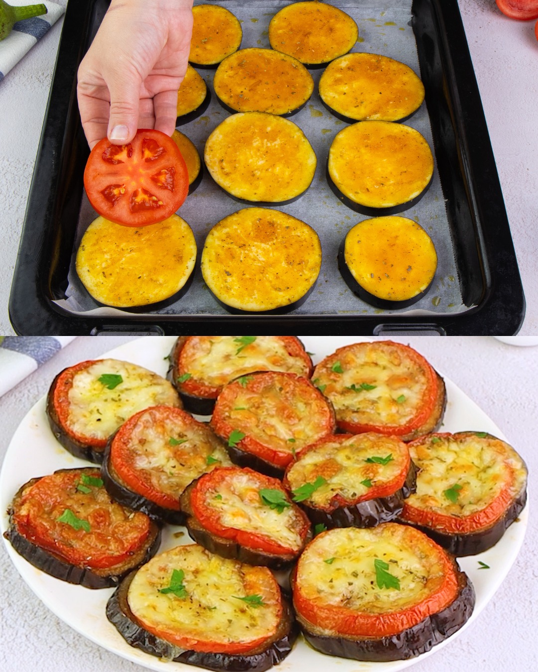 Low-carb (eggplant replaces pizza crust)