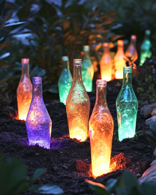 These buried bottle lights can complement a variety of garden styles, from rustic to modern. For a coordinated look, use bottles in similar shapes and colors. For something more eclectic, mix and match hues and sizes. Pair your glowing bottles with natural elements like stone paths, wooden benches, or wrought iron furniture to enhance the magical vibe. Layer in fairy lights or lanterns for added depth and sparkle. The soft glow will beautifully highlight garden features such as flower beds, water fountains, or sculptures.