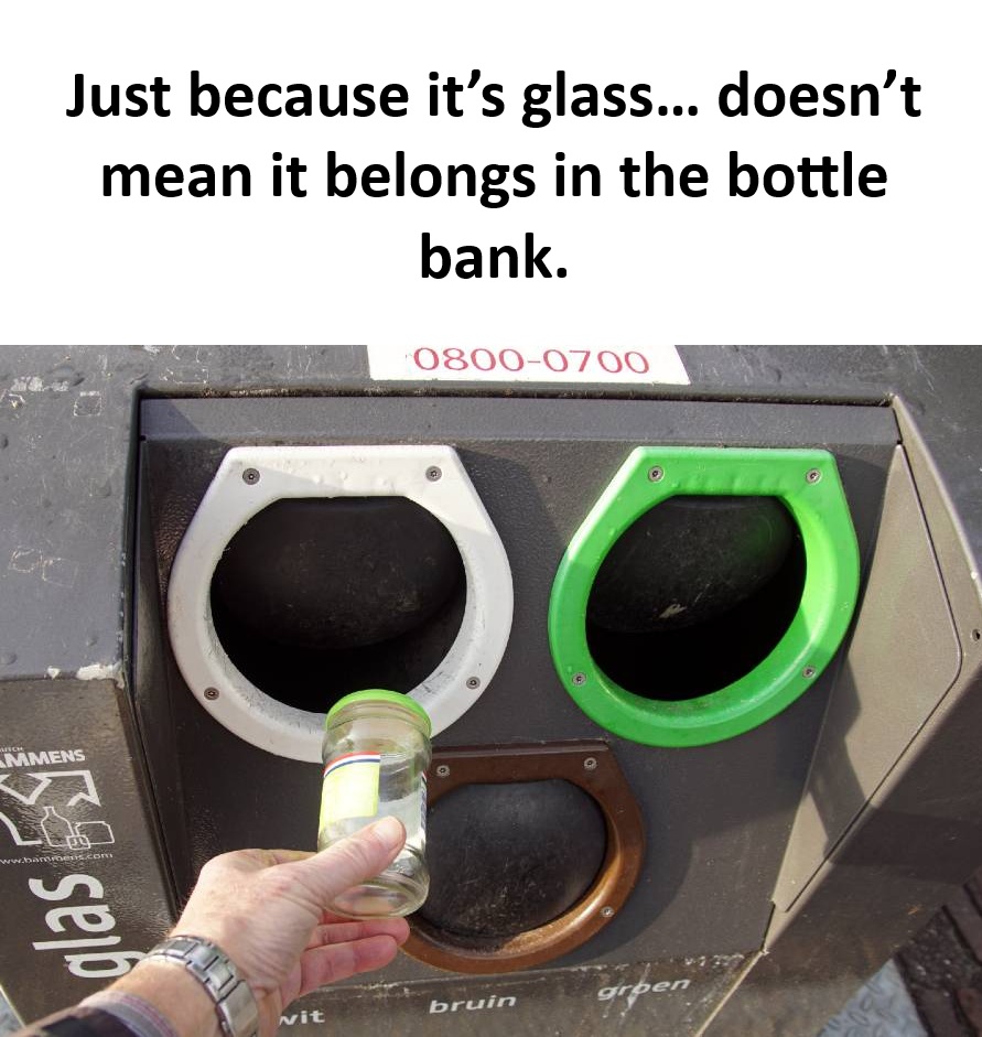 These types of glass should not be placed in the bottle bank. Depending on the type, they should go into regular waste or be taken to a recycling center.