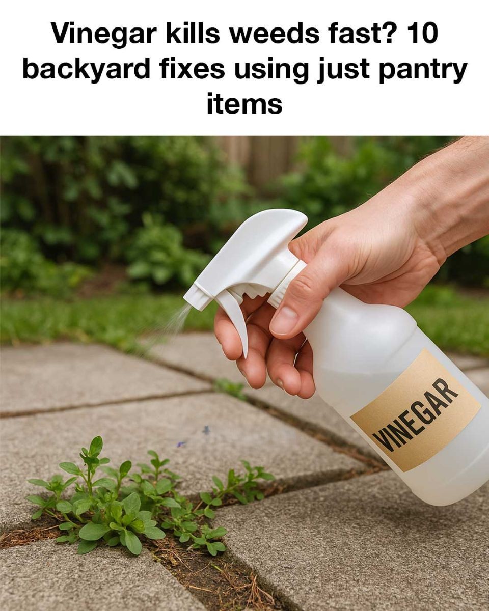 ➡️ For stubborn weeds, add 1 tablespoon of dish soap to the mix. This helps the vinegar stick to the leaves for better absorption.