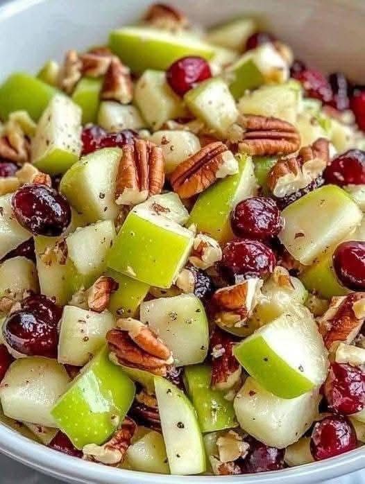 Pour the dressing over the apple mixture. Add the dried cranberries and toasted pecans. Toss gently until everything is evenly coated.