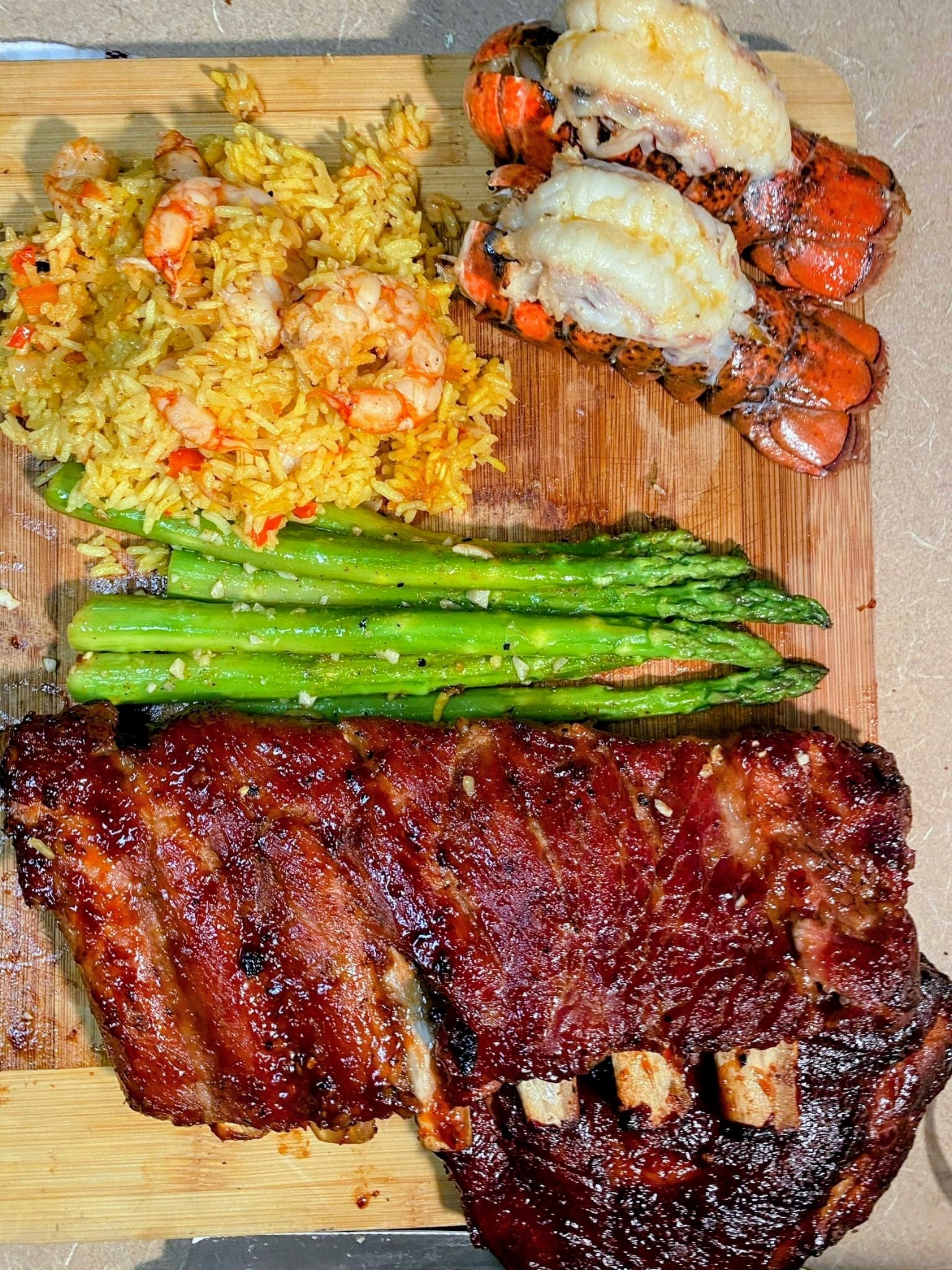 This is the ultimate surf and turf platter that combines smoky, tender BBQ pork ribs with buttery lobster tails, garlicky shrimp rice, and crisp sautéed asparagus. The flavors balance perfectly — the richness of the ribs and lobster is lightened by the freshness of asparagus, while the shrimp rice ties it all together with a savory, slightly spicy touch. A true restaurant-quality meal right at home!