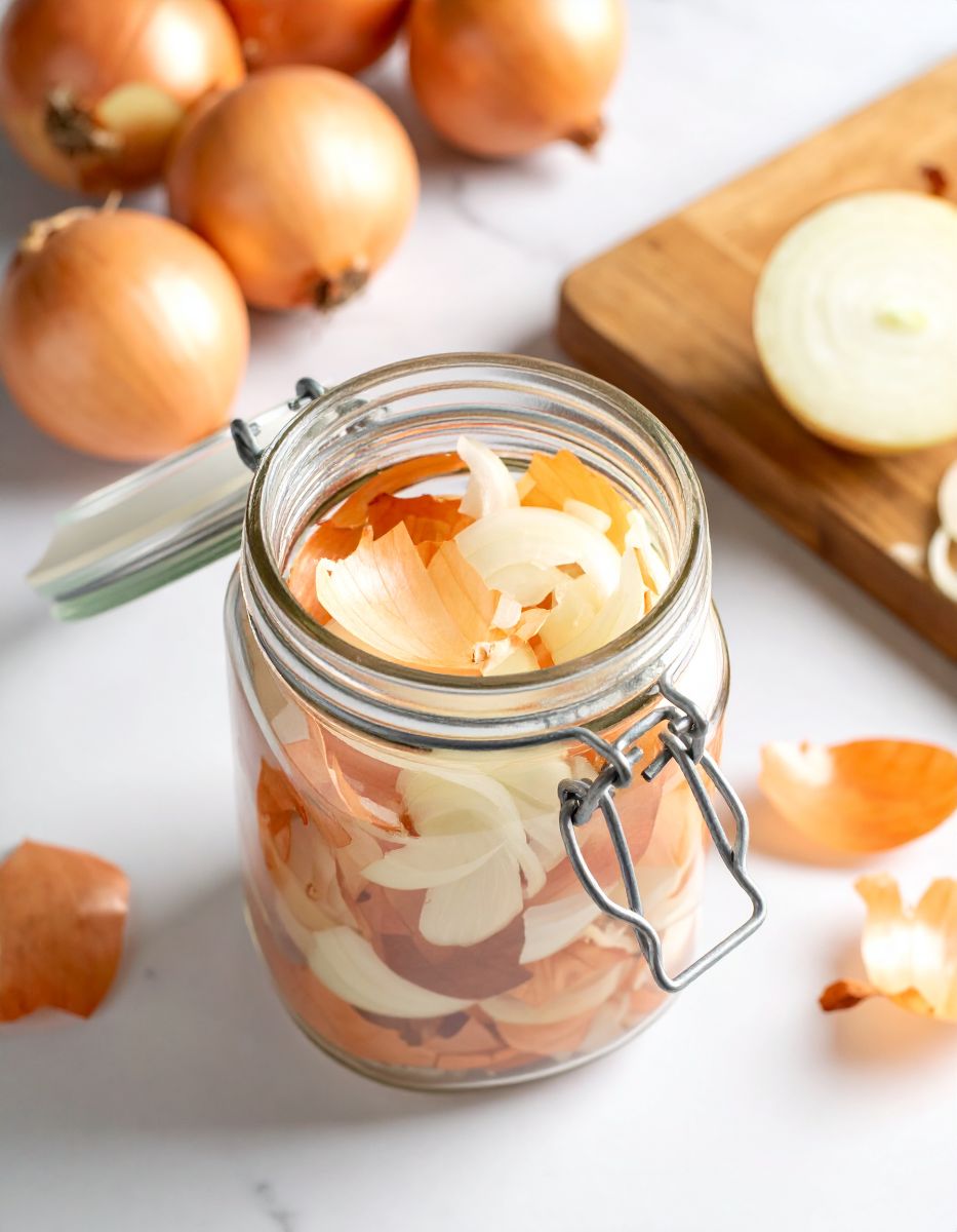 Onion skins can be used to create a natural hair rinse that enhances shine and promotes scalp health. Boil the skins from 4-5 onions in 2 liters of water for about 30 minutes. Allow the mixture to cool, then strain it. After shampooing, pour the onion skin rinse over your hair and let it sit for a few minutes before rinsing with water. The rinse can help improve hair texture and add a natural shine, thanks to the nutrients and antioxidants present in the onion skins.