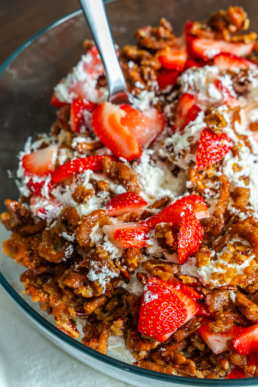 It’s no secret that we love a good vintage-inspired dessert here at 12 tomatoes, especially the ones that are called “salads” that have nary a vegetable in sight. And that is the exact category today’s recipe falls into. This Strawberry Crackle Salad is inspired by the legendary layered Strawberry Pretzel Salad, but instead of stacked ingredients, all that crunch, creamy, and fruity goodness gets mixed together. You enjoy it by the bowlful and if you’re anything like us, then you’ll definitely be going back for seconds!