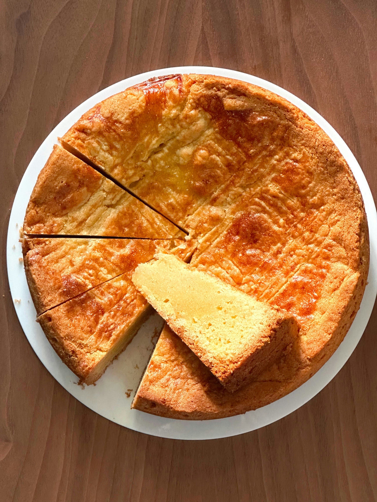 **Dutch Butter Cake** is a dense, rich pastry with a golden crust and a soft, chewy center. It’s traditionally baked in a round or square tin and sliced into small squares or wedges. Unlike fluffy cakes, this dessert is more like a cross between a soft shortbread and a chewy cookie—**but with a deep buttery flavor that steals the show.**