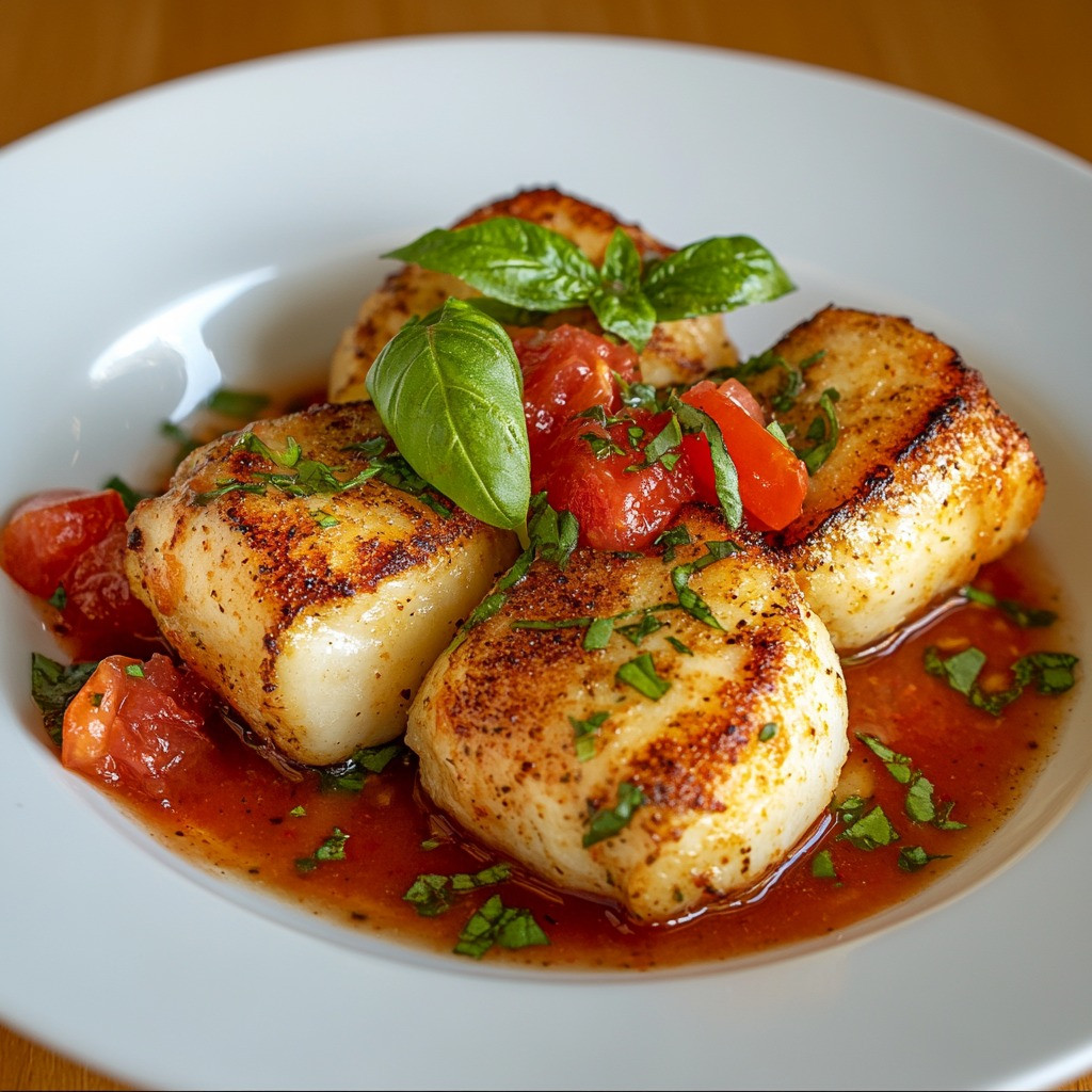 Golden dumplings boast a crispy, flavorful crust with a soft, pillowy interior. When paired with the fresh tomato and basil coulis, they create a contrast of warm and cool, savory and tangy. The coulis itself is a smooth, lightly seasoned sauce made from ripe tomatoes and fresh basil leaves, adding an aromatic depth that brightens the dish.