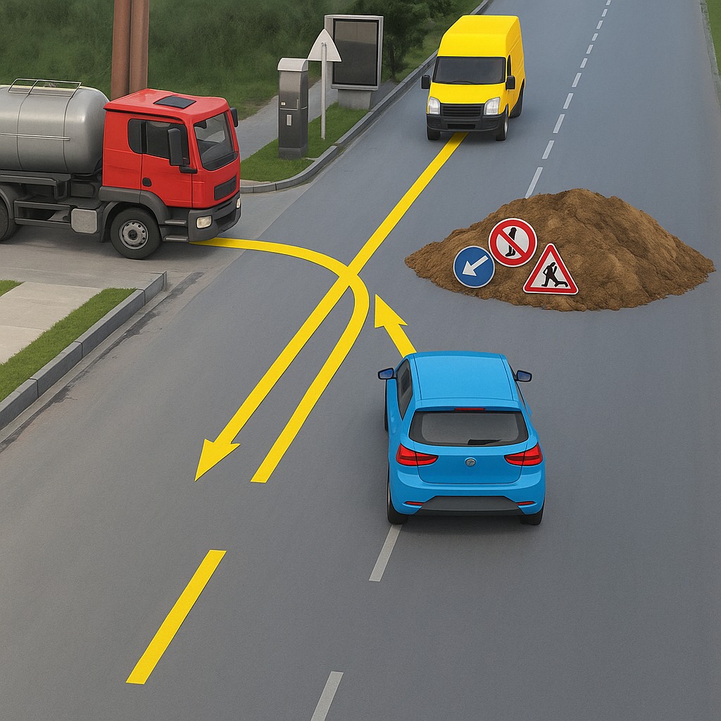 The illustration (attached to the original text) shows a situation where a blue car encounters an obstacle in its lane. To get around it, it must enter the oncoming lane, where a van (minibus) is traveling. To the left of the blue car, on an adjacent road, there is a truck planning to turn right, so their paths could cross with both the minibus and the blue car.