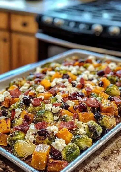 π Roasted Brussels Sprouts & Butternut Squash with Bacon, Cranberries, and Feta π₯π§