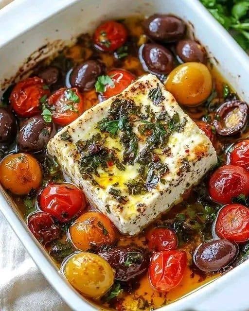 Baked Feta with Tomatoes and Olives – a Mediterranean-inspired dish bursting with flavors of creamy feta, juicy tomatoes, and briny olives.