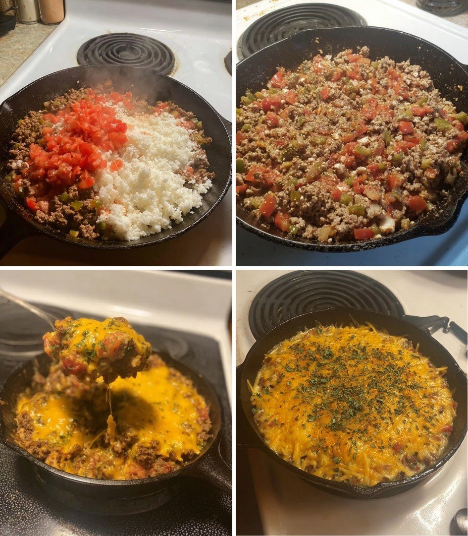Stir in diced tomatoes and cauliflower rice. Season with cumin, smoked paprika, oregano, chili flakes, salt, and pepper. Mix everything well and let it cook for 5–7 minutes, stirring occasionally, until the cauliflower softens and most of the liquid has reduced.