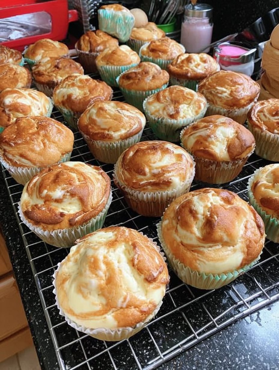 Line a muffin tin with paper cups. Fill each cup two-thirds full with the muffin batter. Add a small spoonful of the yogurt mixture on top and swirl gently using a toothpick or knife to create a marble pattern.