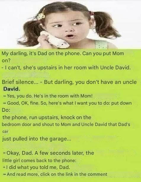A sudden silence fell between the man and the little girl. Indeed, there had never been an Uncle David in his family. In fact, he didn’t know anyone with that name. The man wondered who this David was and why he was with his wife. He then said to the little girl, “But darling, you don’t have an Uncle David.” To which she replied, “Yes, you do, he’s in the room with Mommy!” The man then had an idea to find out if his wife was cheating on him. He explained to the little girl what she should do.
