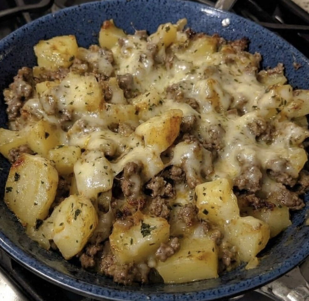 Season the beef with salt, pepper, and Italian seasoning. Add a little olive oil to the skillet and stir in the cooked potatoes. Let them cook for a few minutes until they become lightly browned and crispy on the edges.