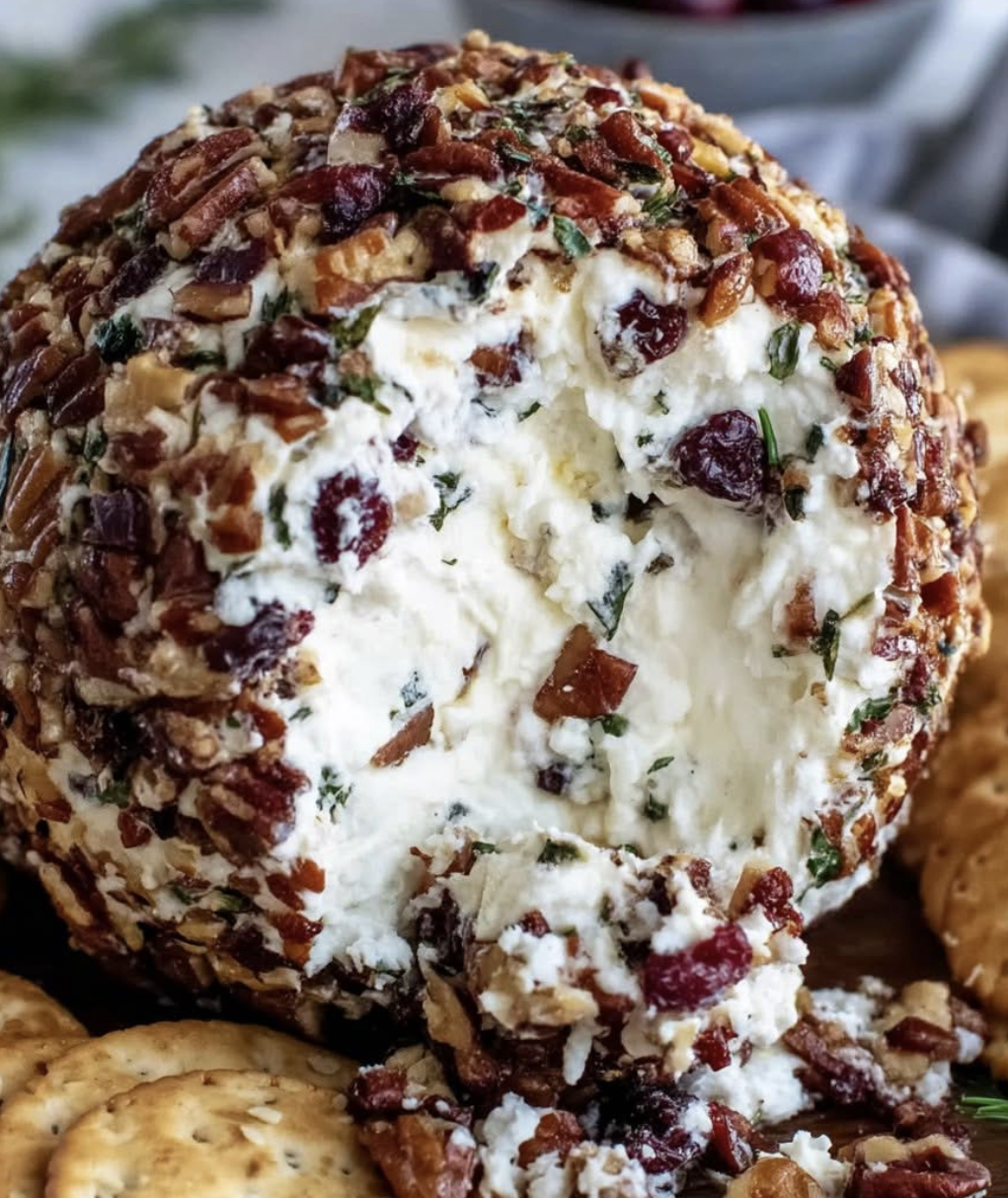 3. Prepare the coating: Just before serving, combine the remaining cranberries, pecans, and chives on a plate.