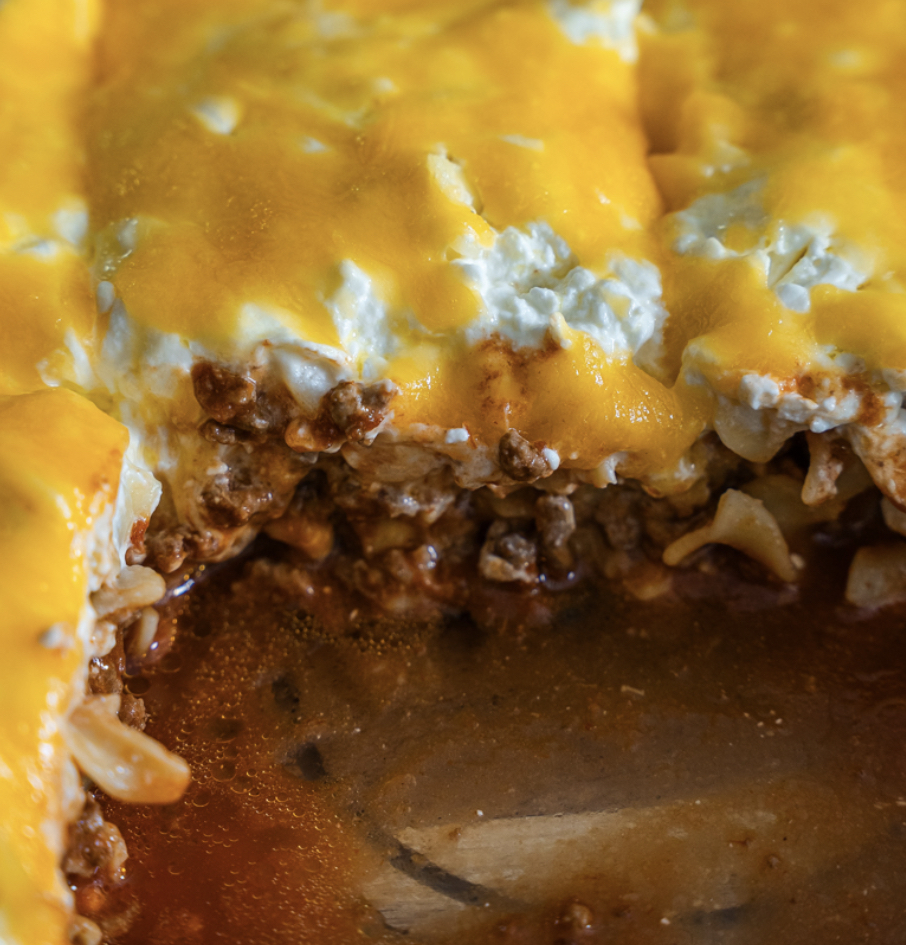Spread half of the cooked egg noodles evenly in the bottom of the prepared dish. Spoon the beef mixture over the noodles and spread evenly. Top with remaining noodles.