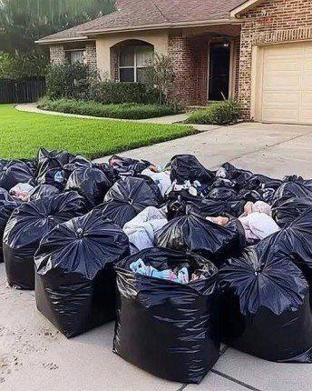 Garbage bags were scattered across the grass. Toys, clothes, books—Ava’s pink blanket was tangled in the bushes.