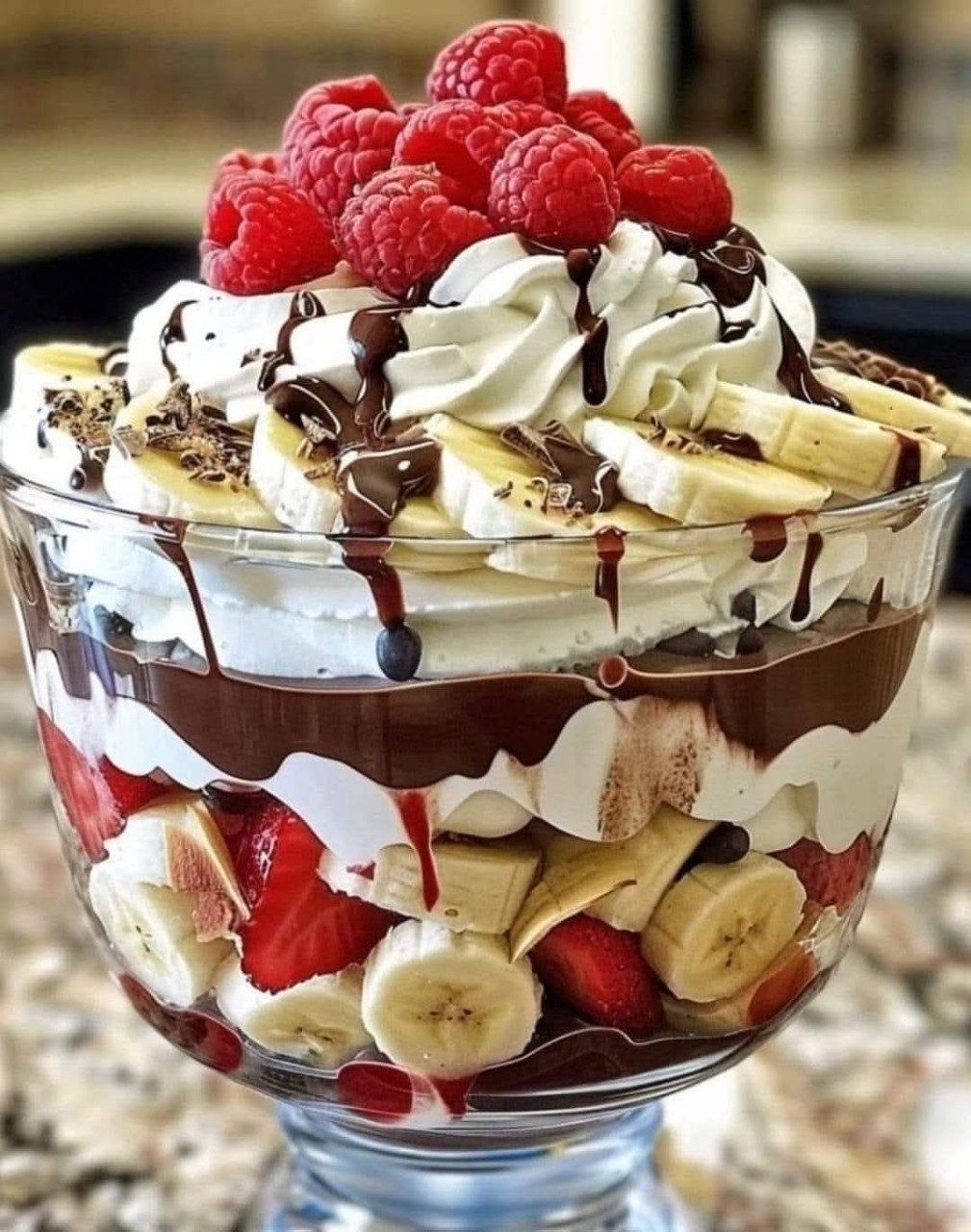 A layered dessert with fresh fruit, creamy pudding, and chocolate—perfect for any occasion!