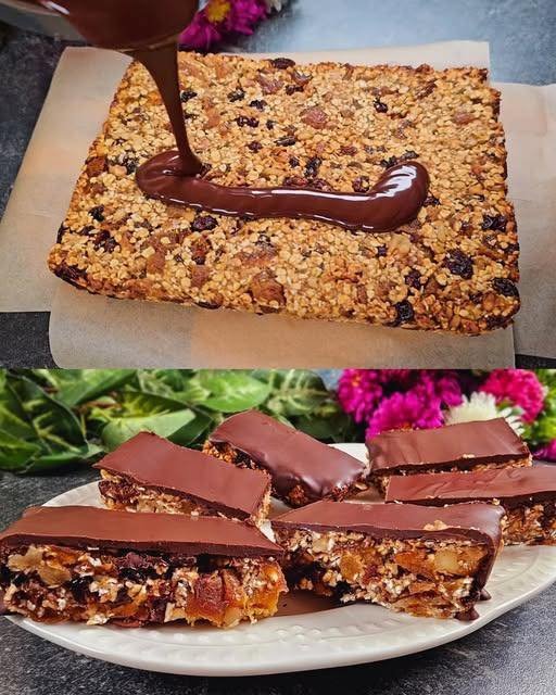 Glaze: Pour the melted chocolate over the oat base and spread it evenly to the edges.