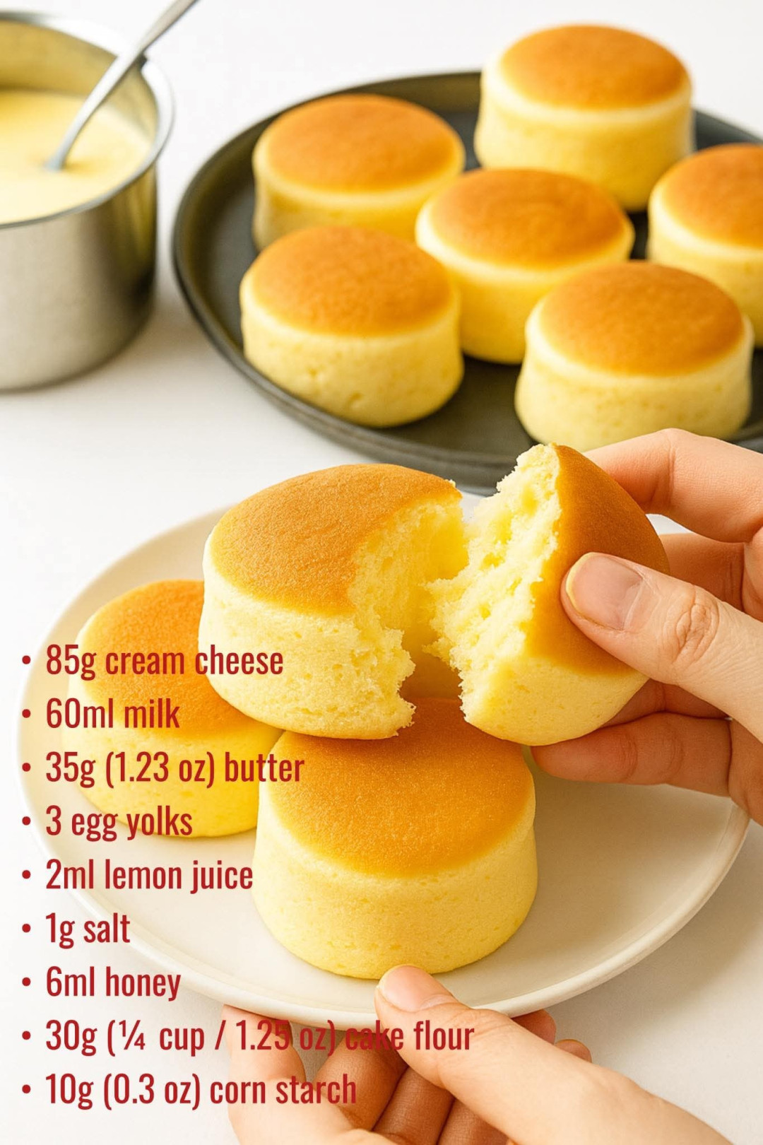 Ingredients • 85g cream cheese • 60ml milk • 35g butter • 3 egg yolks • 2ml lemon juice • 1g salt • 6ml honey • 30g cake flour • 10g corn starch Meringue • 3 egg whites • 60g sugar • 2ml lemon juice