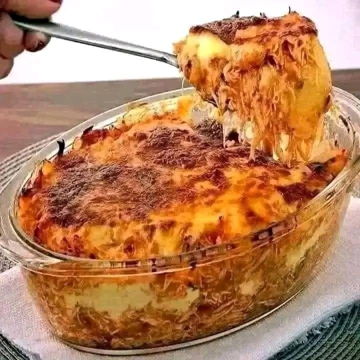 ✅ Ingredients: 2 tablespoons olive oil 1 chopped onion 2 crushed garlic cloves 450g cooked and shredded chicken 1 cup tomato sauce (tea) 1 cup of cream cheese (200g) Salt, black pepper and chopped parsley to taste 500g peeled potato olive oil for greasing 400g grated provolone cheese for sprinkling ✅Method of preparation